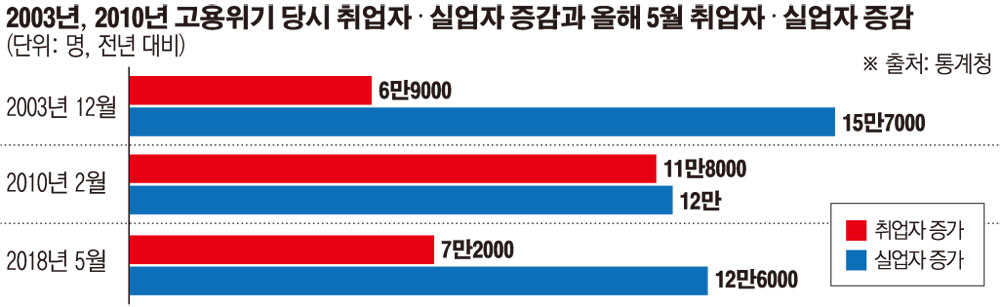 실업자가 취업자보다 더 큰 폭으로 늘어나 고용불황이 장기간 지속했던 때는 현재와 같은 기준으로 취업자·실업자 통계가 작성된 2000년 6월 이래 2003년 4월부터 12월까지, 2008년 12월부터 2010년 2월까지 두 차례뿐이었다. 2003년 초에는 LG카드(신한카드의 전신)의 무분별한 가입자 유치에서 촉발된 카드대란이, 2008년에는 미국 서브프라임 모기지 사태(2007년 4월, 2008년 9월)에서 비롯된 글로벌 금융위기가 있었다.