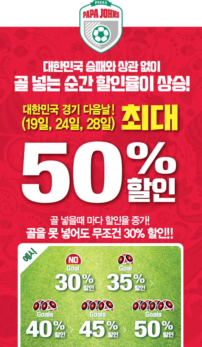 더불어 대한민국 경기가 열리는 당일인 18일, 23일, 27일에는 방문 포장 고객에게 40% 할인을 제공한다. 라지 사이즈 이상 피자 주문 시에 할인 혜택을 받을 수 있다.