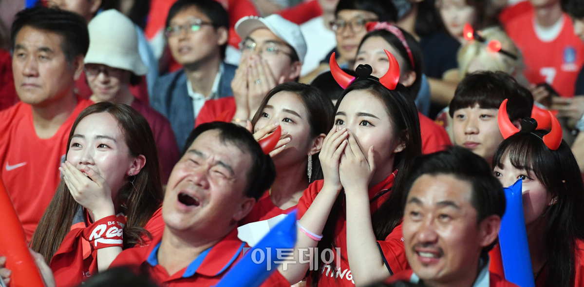 '2018 러시아월드컵' 대한민국과 스웨덴과의 조별예선 첫 경기가 열린 18일 서울 종로구 서울광장에서 태극전사의 선전을 기원하며 열띤 거리응원을 벌이던 시민들이 아쉬워하고 있다. 경기결과 대한민국이 0대1로 패했다. 오승현 기자 story@