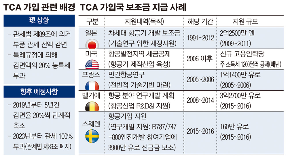 정부가 항공기 부품 관세감면 추가 연장 불가 방침을 확고하게 밝히면서 항공운송업계가 ‘WTO(세계무역기구) TCA(민간항공기협정)’ 가입을 요구하고 나섰다. 항공산업 경쟁력 강화를 위해서는 TCA가입이 필수적이라는 입장이다. 그러나 정부는 TCA 가입이 항공제조기술 경쟁력 발전를 저해할 수 있다고 우려하고 있다.