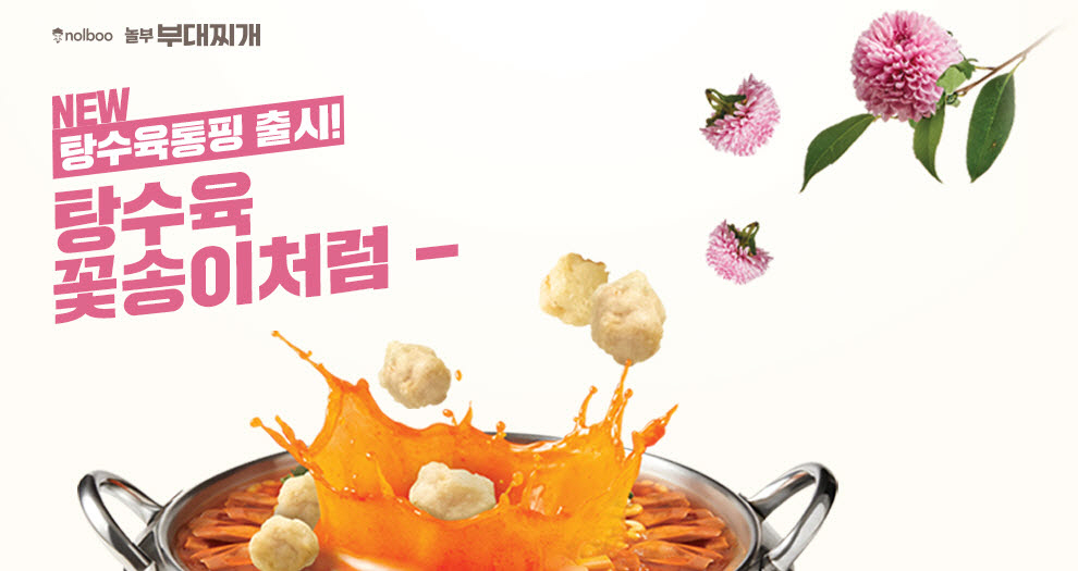 19일 업계에 따르면 놀부부대찌개는 ‘꽃송이 탕수육 통핑’을 선보였다. ‘통핑’은 놀부가 동종업계 최초로 제시한 새로운 형태의 부대찌개 곁들임 메뉴로 통째로 넣어 먹는 토핑을 의미한다.