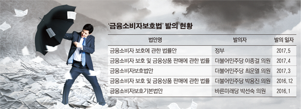 한편, 20대 국회에서 발의된 금융소비자 보호 관련 법안은 정부 발의안 1건과 의원 발의안 4건 등 총 5건이다. 이 가운데 더불어민주당 이종걸 의원 발의안은 금융위 업무인 금융 정책과 감독을 분리하고 금감원도 감독업무와 소비자 보호 업무를 나누는 방안을 골자로 한다. 반면, 바른미래당 박 의원 안은 금융위원회는 그대로 두고, 금감원 업무를 분리하는 방안을 담고 있다.