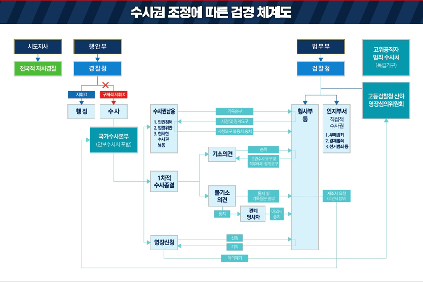 다만 수사에 대한 검찰의 통제권은 보장할 수 있도록 했다. 검사는 송치 후 공소제기 여부 결정과 공소유지 또는 경찰이 신청한 영장의 청구에 필요한 경우 보완수사를 요구할 수 있다. 또 정당한 이유 없이 보완수사요구에 불응할 경우 직무배제, 징계 요구권, 경찰의 수사권 남용시 시정조치 요구권, 시정조치 불응시 송치 후 수사권 등 통제력을 갖출 수 있게 했다.