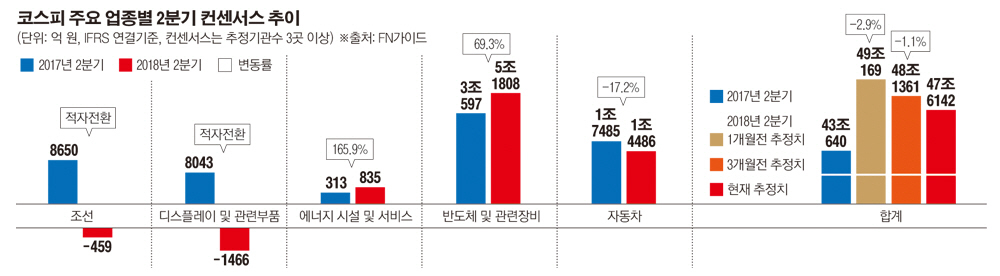 미·중 무역분쟁, 원화 약세, 바이오주 급락 등으로 코스피지수가 부진한 흐름을 이어가고 있는 가운데, 2분기 상장사들의 실적 전망치(컨센서스)도 점차 낮아지고 있다. 증권업계는 실적 컨센서스 하향 조정과 함께 일부 업종 쏠림 현상을 우려하고 있다.
