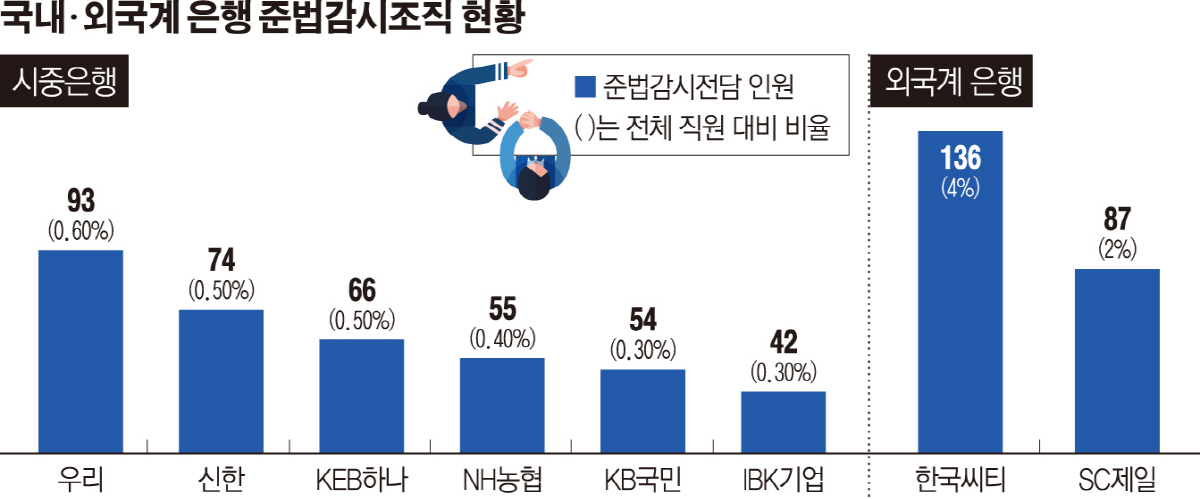 금감원 관계자는 “은행마다 준법감시 업무 규정에 따라 필요한 인원이 다르다”면서도 “내부통제 문제를 사전에 막는 것은 준법감시인과 경영진 책임”이라고 말했다.