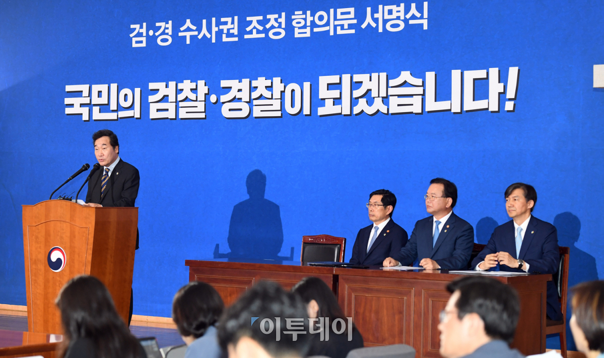 이낙연 국무총리가 21일 서울 세종로 정부서울청사별관 국제회의장에서 열린 '검·경 수사권 조정 합의문 서명식'에서 합의문에 관한 대국민 담화를 발표하고 있다. 이날 발표된 합의문에는 경찰의 '1차적 수사·종결권' 및 검찰의 통제권한 등이 담겼다. 오승현 기자 story@