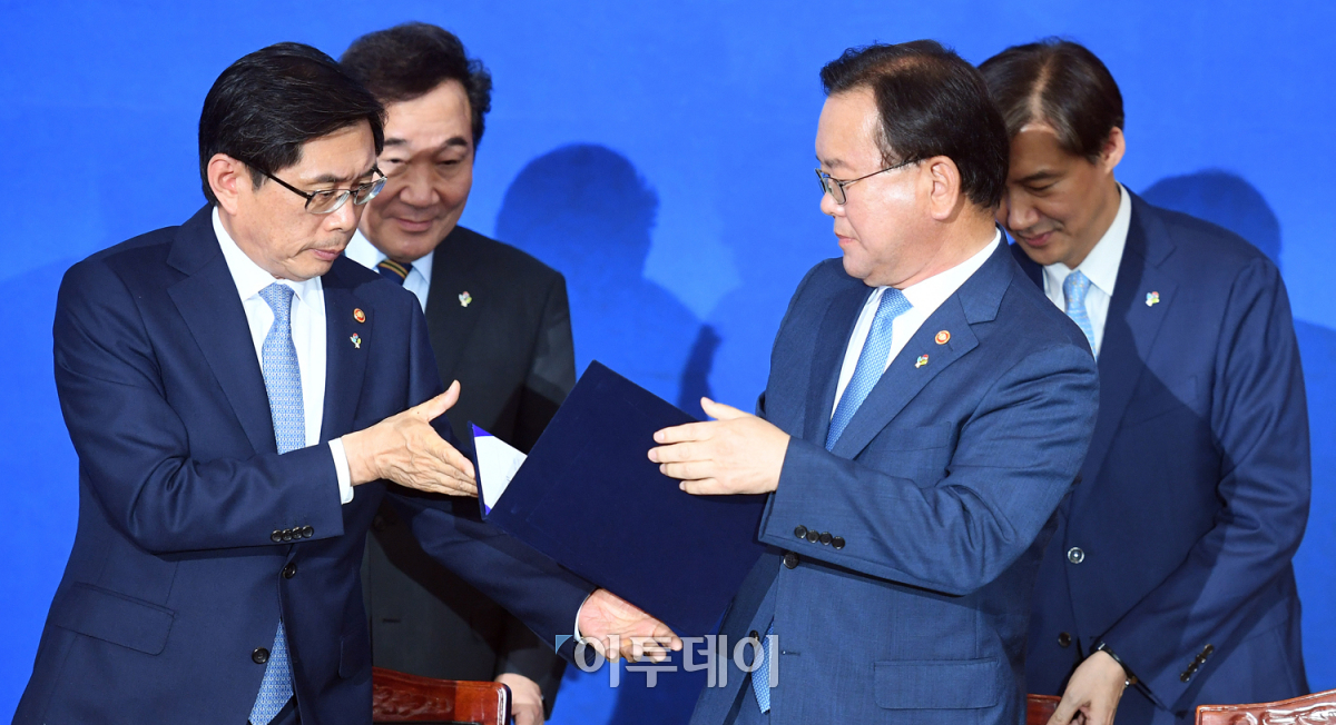 '검·경 수사권 조정 합의문 서명식'이 열린 21일 서울 세종로 정부서울청사별관 국제회의장에서 이낙연 국무총리의 임석 하에 박상기 법무부 장관과 김부겸 행정안전부 장관이 합의문에 서명하고 있다. 이날 발표된 합의문에는 경찰의 '1차적 수사·종결권' 및 검찰의 통제권한 등이 담겼다. 오승현 기자 story@