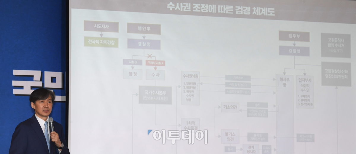조국 민정수석비서관이 21일 서울 세종로 정부서울청사별관 국제회의장에서 열린 '검·경 수사권 조정 합의문 서명식'에서 합의안의 세부사항을 설명하고 있다. 이날 발표된 합의문에는 경찰의 '1차적 수사·종결권' 및 검찰의 통제권한 등이 담겼다. 오승현 기자 story@