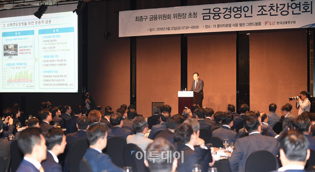 최종구 금융위원회 위원장 초청 ‘금융경영인 조찬강연회’가 열린 22일 오전 서울 중구 더플라자호텔 그랜드볼룸에서 최 위원장이 ‘금융분야 데이터활용 및 정보보호 종합방안’을 주제로 강연하고 있다. 오승현 기자 story@