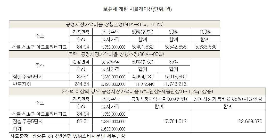 원종훈 KB국민은행 WM스타자문단 세무팀장은 공정시장가액비율이 기존 80%에서 85%로 인상되고, 세율이 오를(0~0.5%포이트) 경우를 기준으로 2주택자의 세금 변화를 추산했다.