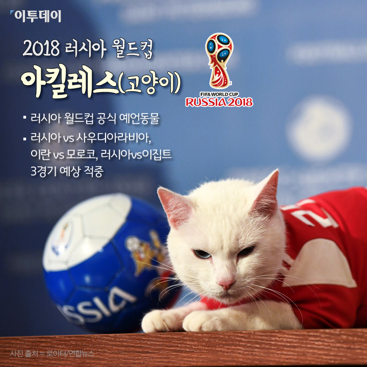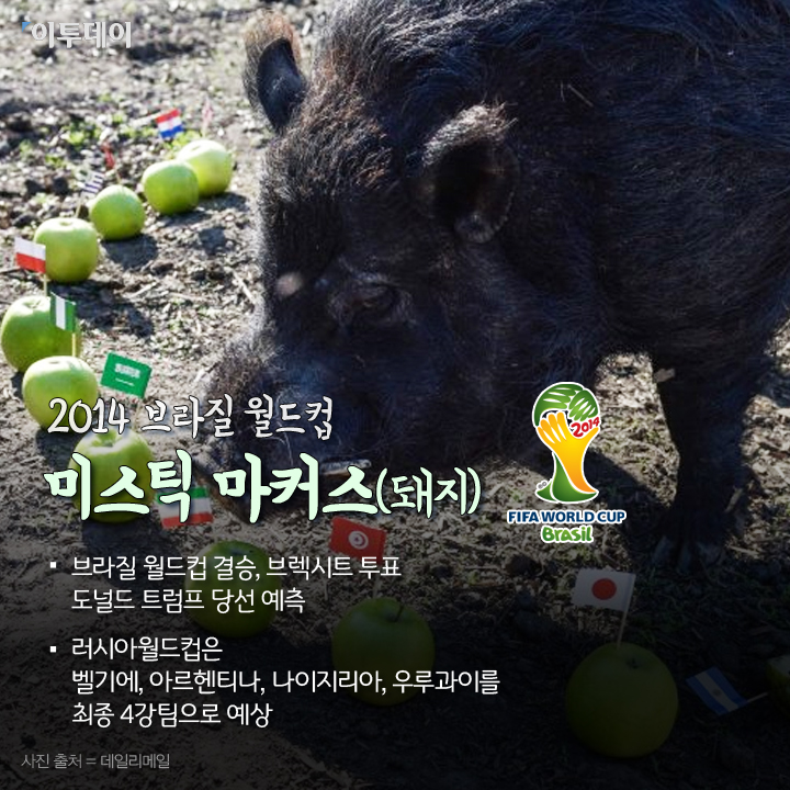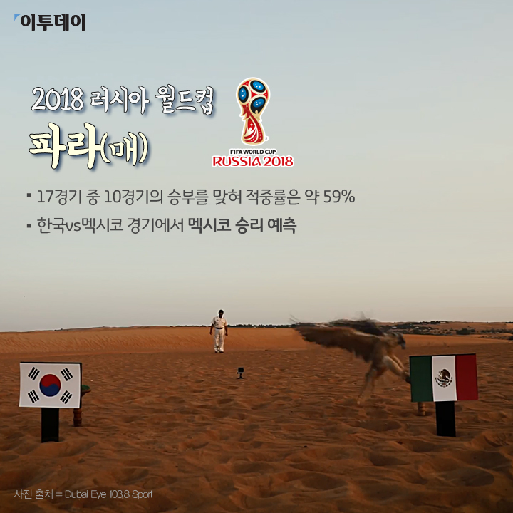 점쟁이 문어 '파울'에 이어 이번 러시아 월드컵에서는 흰색 고양이 아킬레스가 축구팬들의 관심을 모으고 있는데요. 이와 함께 2014 브라질 월드컵, 2016 미국 대선과 영국의 브렉시트, 윔블던 경기 결과를 모두 정확하게 맞힌 영국의 점쟁이 돼지가 2018 러시아 월드컵 결과를 예측해 궁금증을 자아냈습니다. 또한 '적중률 59%'를 자랑하는 두바이의 매는 24일 0시(한국시각) 열리는 멕시코 대 한국의 경기에서 멕시코의 승리를 예측했다고 합니다.