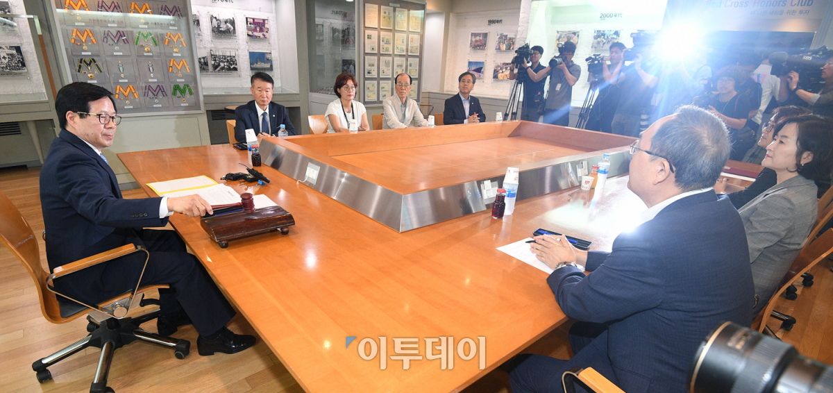 남북적십자회담에서 합의된 8·15를 계기 이산가족 상봉 행사의 상봉 후보자 선정 기준이 마련됐다. 25일 서울 중구 대한적십자사 서울사무소에서 이산가족 상봉 후보자 선정 기준 마련을 위한 인선위원회가 열리고 있다. 이날 적십자는 인선위에서 결정된 선정 기준을 적용한 무작위 컴퓨터 추첨을 통해 이산가족 상봉 신청자 5만7천여 명 중 500명의 후보자를 선정했다. 오승현 기자 story@