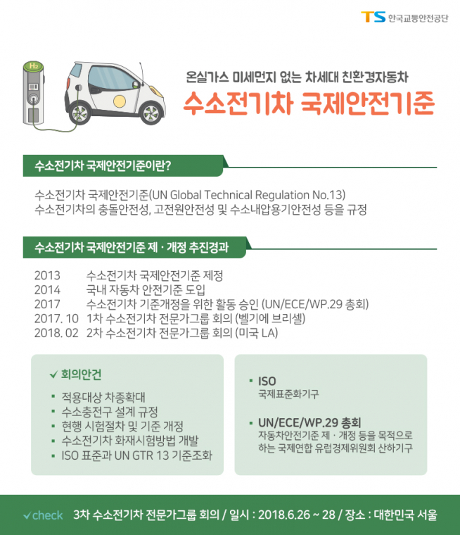 이후, 국제사회에서 수소전기차 산업발전과 기술수준을 반영하는 적용대상 차종의 확대 등에 관한 기준 개정 필요성이 제기됐고, 자동차 국제안전기준을 논의하는 UN/ECE/WP.29 총회는 2017년 3월 수소전기차 기준개정을 위한 활동을 승인했다.