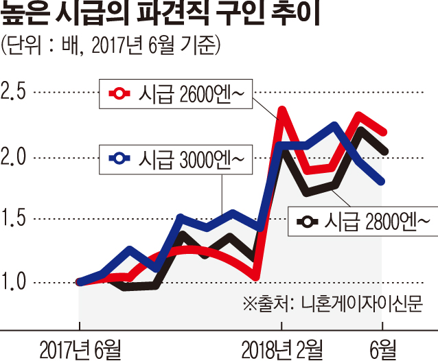 일본에서 파견 직원은 정직원이 될 수 없는 사람이 어쩔 수 없이 선택하는 길이라는 인식이 강했다. 그러나 최근 파견직 구인공고를 보면 그렇지 않다. 채용서비스 기업 엔재팬에 따르면 일본서 시급 3000엔(약 3만 원) 이상 파견직 일자리는 1년 사이 80% 급증했다. 사물인터넷(IoT)과 같은 수요가 높은 기술을 갖추면 시급이 2~3배로 뛰기도 한다.