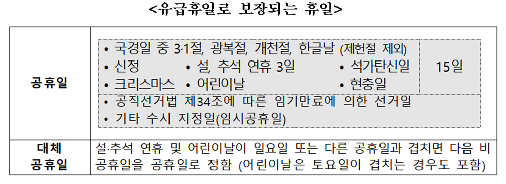 유급휴일이 보장되는 휴일은 국경일 중 3·1절, 광복절, 개천절, 한글날(제헌절 제외), 신정, 설과 추석 연휴 각각 3일, 부처님오신날, 현충일, 크리스마스, 어린이날 등 15일이다.