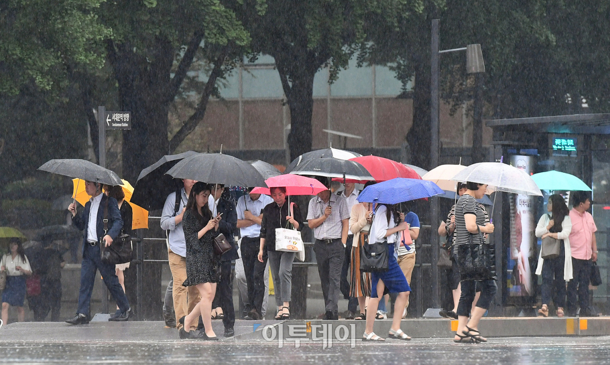 장마가 시작됐다. 장마전선의 영향으로 전국에 많은 비가 내리기 시작한 26일 오전 서울 세종로 광화문네거리에서 시민들이 쏟아지는 장맛비를 피해 출근길 발걸음을 재촉하고 있다. 기상청은 장마전선이 북상하며 수도권에 돌풍을 동반한 120mm에 이르는 많은 비가 내릴 것으로 내다보고, 안전사고 및 시설물 관리에 각별한 주의를 당부했다. 오승현 기자 story@