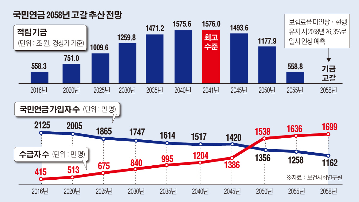 26일 보건사회연구원의 ‘인구구조 변화와 사회보험 장기재정전망(Ⅱ)’ 연구보고서에 따르면, 국민연금 수급자가 본격적으로 발생하는 2040년대 이전까지는 보험료 수입이 연금 지출보다 많은 구조를 유지할 전망이다. 하지만 이후부터 연금 급여 지출이 증가하면서 2040년대 초반에 재정수지가 적자로 돌아설 것으로 추산했다. 2041년에 적립기금은 최고 수준에 이르지만(경상가 1576조90억 원, 2016년 불변가 기준 852조 원), 그 이후 연금 급여 등 지출 규모 증가로 점차 줄어들어 2058년에 소진된다.