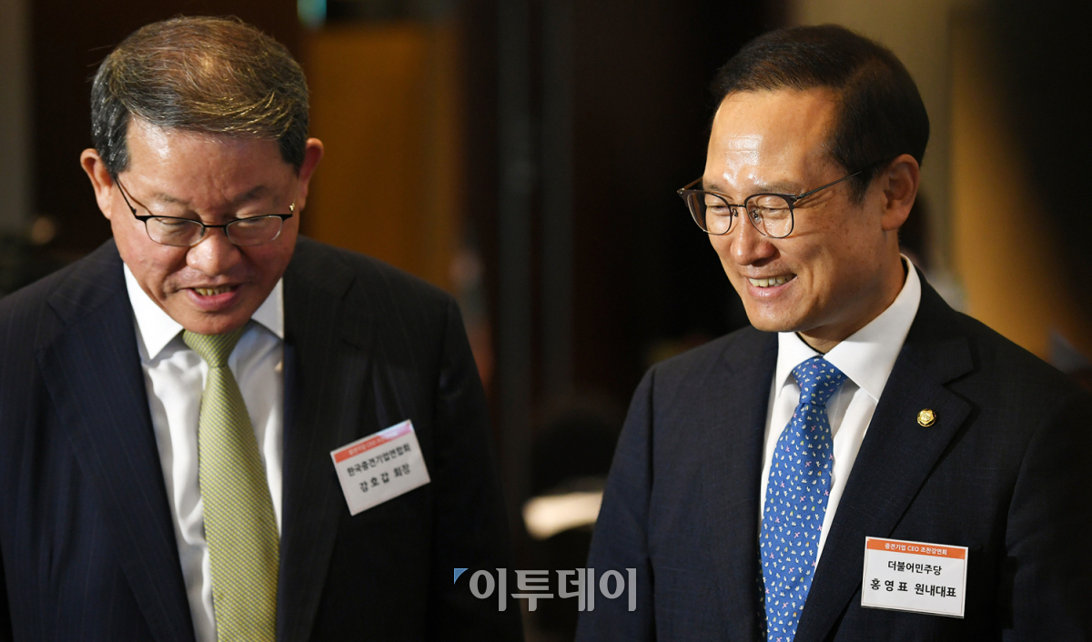 홍영표(오른쪽) 더불어민주당 원내대표 초청 '제172회 중견기업 CEO 조찬강연회'가 열린 27일 오전 서울 여의도 63컨벤션센터에서 홍 원내대표가 강호갑 한국중견기업연합회장을 비롯한 참석자들과 인사를 나누고 있다. 이날 한국중견기업연합회와 홍 원내대표는 경제의 불확실성이 높아지고 있는 최근 경제·사회적 상황에 중견기업의 과제를 점검하고, 지속가능한 발전 전략을 모색했다. 오승현 기자 story@