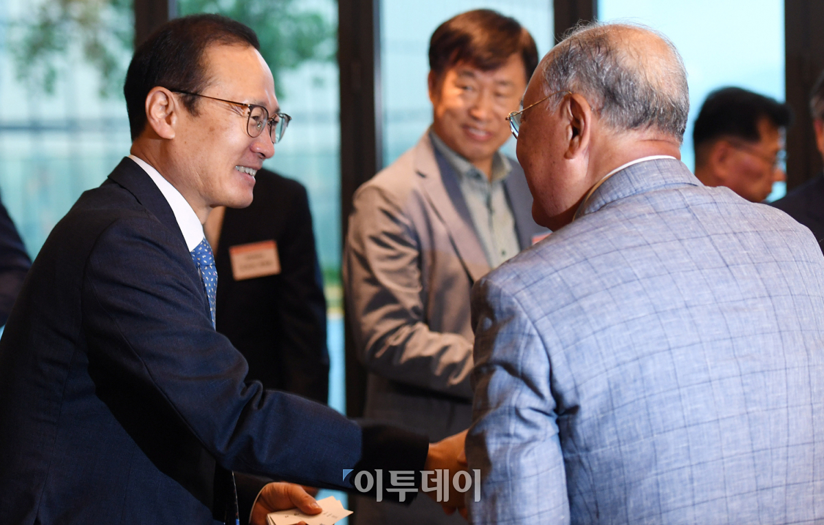 홍영표(왼쪽) 더불어민주당 원내대표 초청 '제172회 중견기업 CEO 조찬강연회'가 열린 27일 오전 서울 여의도 63컨벤션센터에서 홍 원내대표가 참석자들과 인사를 나누고 있다. 이날 한국중견기업연합회와 홍 원내대표는 경제의 불확실성이 높아지고 있는 최근 경제·사회적 상황에 중견기업의 과제를 점검하고, 지속가능한 발전 전략을 모색했다. 오승현 기자 story@