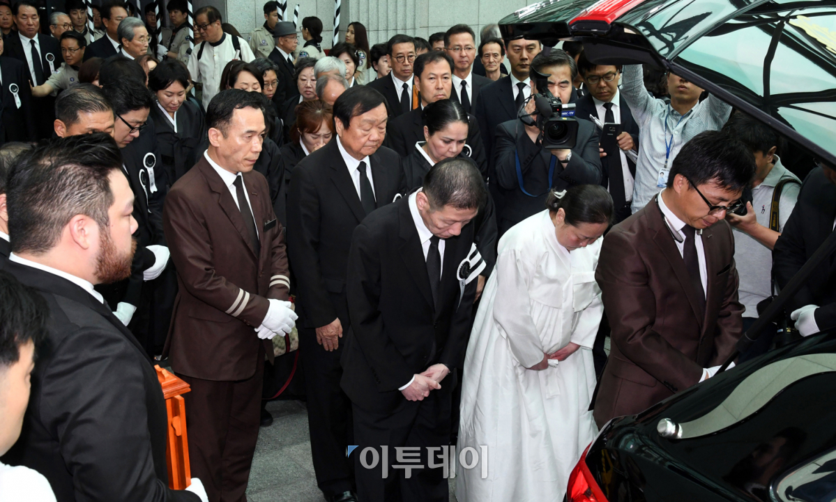 김종필 전 국무총리의 영결식이 엄수된 27일 오전 서울 송파구 서울아산병원에서 유족들이 고인에게 인사하고 있다. 사진공동취재단