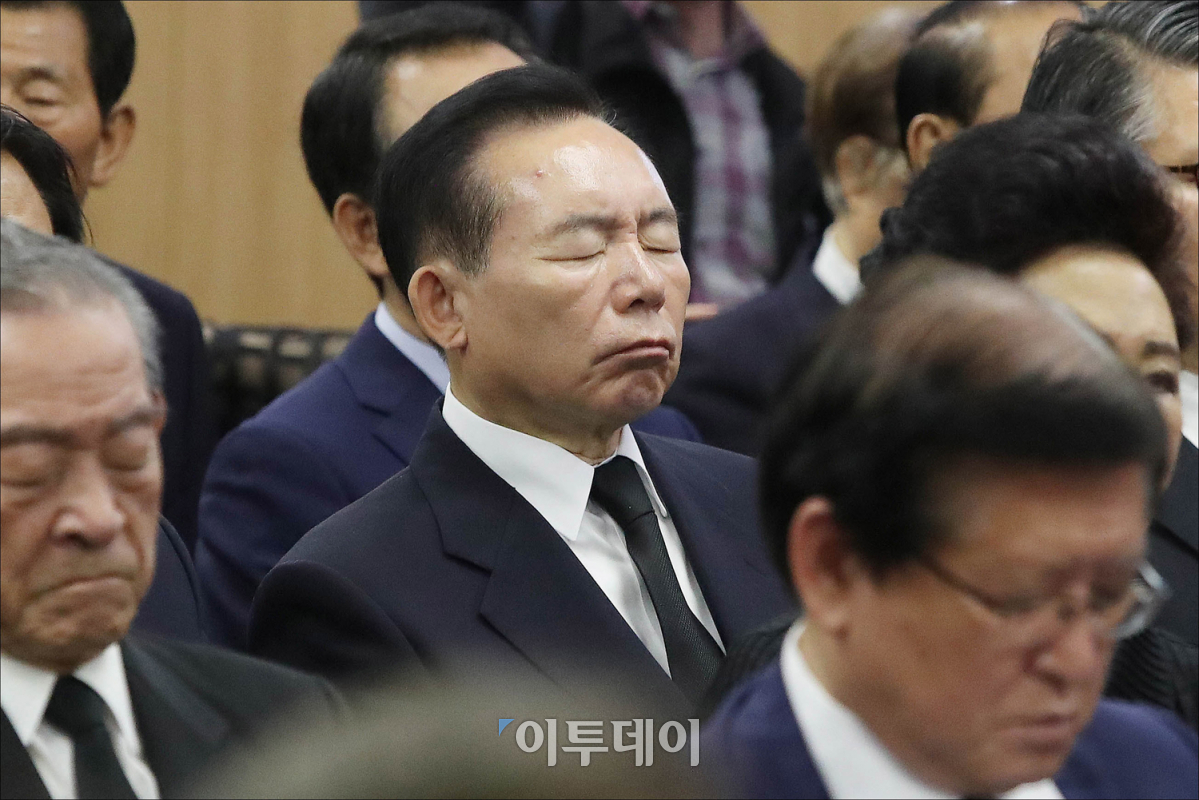 이인제 자유한국당 전 충남도지사 후보가 27일 오전 서울 송파구 서울아산병원에서 엄수된 고 김종필 전 국무총리의 영결식에 참석하고 있다. 사진공동취재단