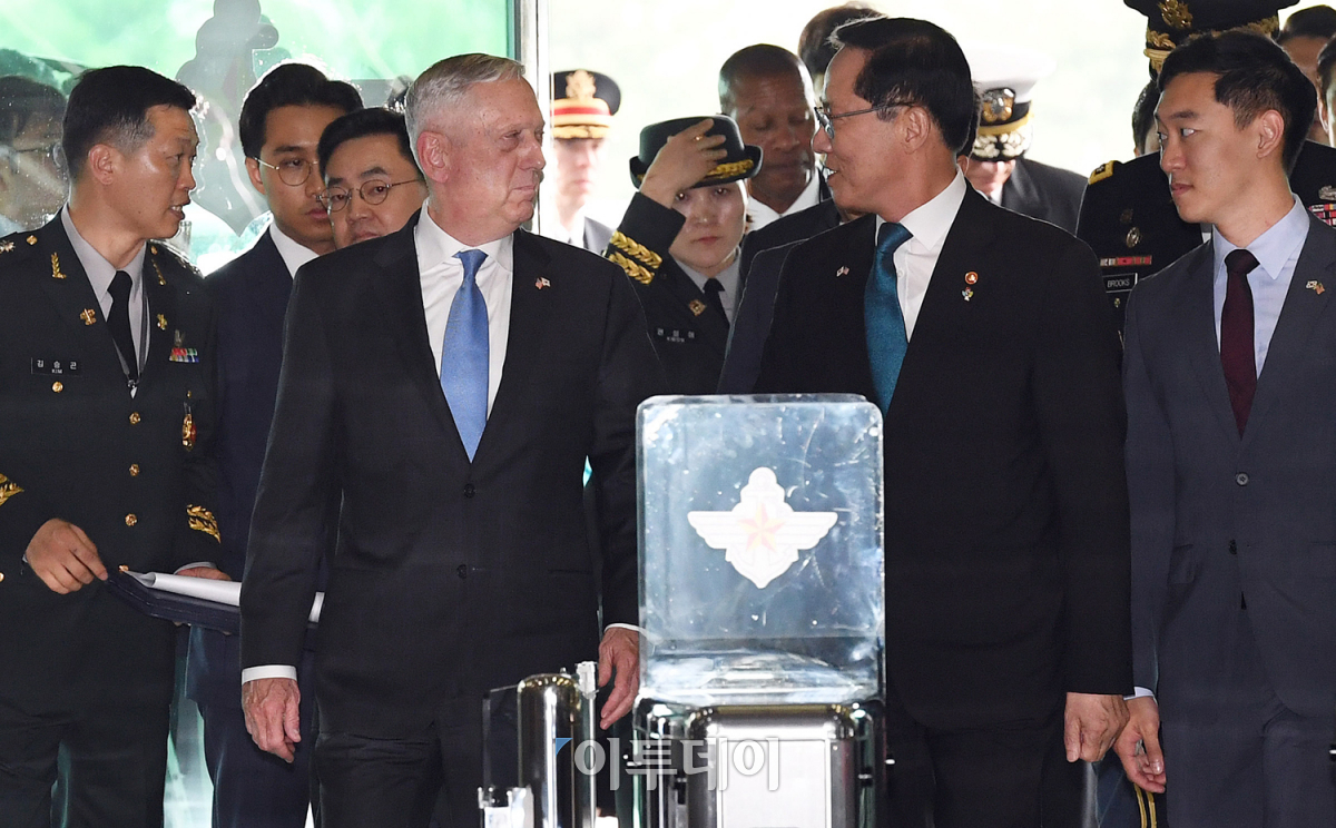 '한·미 국방장관 회담'이 열린 28일 오후 서울 용산구 국방부 청사에서 송영무 국방부 장관과 제임스 매티스(James Norman Mattis) 미국 국방장관이 의장대 사열 후 회담장으로 향하고 있다. 국방부는 "이번 회담에서 남북 및 북미정상회담 합의사항 이행을 위한 한·미 국방 당국 간 협력 사안과 전작권 전환 등 주요 동맹 사안 등을 논의할 예정"이라 밝혔다. 오승현 기자 story@