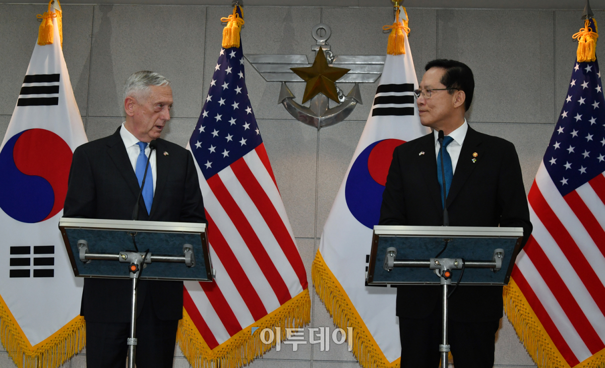 '한·미 국방장관 회담'이 열린 28일 오후 서울 용산구 국방부 청사에서 송영무 국방부 장관과 제임스 매티스(James Norman Mattis) 미국 국방장관이 회담에 앞서 인사말을 하고 있다. 국방부는 "이번 회담에서 남북 및 북미정상회담 합의사항 이행을 위한 한·미 국방 당국 간 협력 사안과 전작권 전환 등 주요 동맹 사안 등을 논의할 예정"이라 밝혔다. 오승현 기자 story@