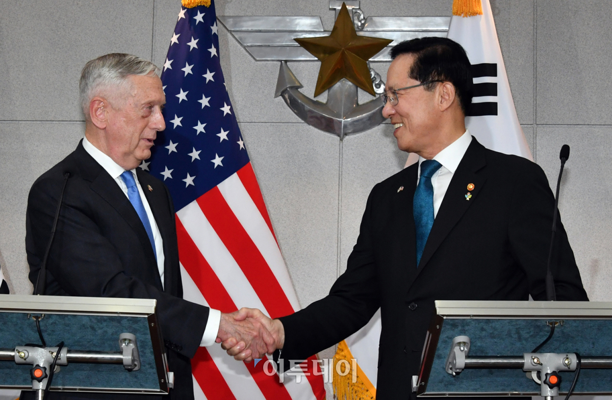 '한·미 국방장관 회담'이 열린 28일 오후 서울 용산구 국방부 청사에서 송영무 국방부 장관과 제임스 매티스(James Norman Mattis) 미국 국방장관이 회담에 앞서 악수하고 있다. 국방부는 "이번 회담에서 남북 및 북미정상회담 합의사항 이행을 위한 한·미 국방 당국 간 협력 사안과 전작권 전환 등 주요 동맹 사안 등을 논의할 예정"이라 밝혔다. 오승현 기자 story@