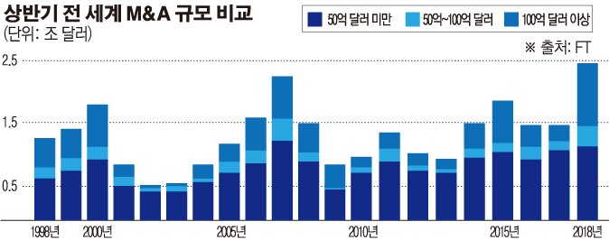 미국과 중국의 무역 전쟁, 이탈리아와 스페인 등이 촉발한 유로존(유로화 사용 19개국) 정치 불안에 대한 우려가 커지고 있음에도 전 세계 M&A 거래 규모는 전년 동기보다 65% 증가했다. 도널드 트럼프 대통령의 법인세 감면과 강력한 경제성장에 힘입어 미국 기업들이 산업을 통합하거나 경쟁력을 키우기 위한 인수를 추진한 덕이다.