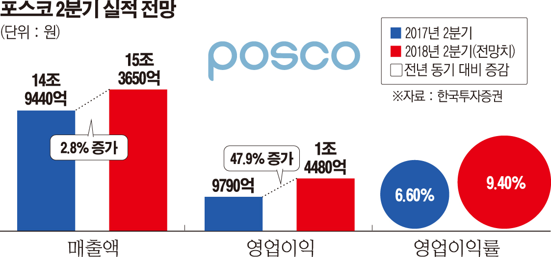 미래에셋대우도 비슷한 전망을 내놓았다. 이 업체는 포스코가 2분기 연결기준 영업이익 1조3000억 원 가량을 기록할 것으로 전망했다. 이는 지난해 동기 대비 34.7% 증가한 수치다. 같은 기간 매출액은 16조4020억 원으로 2017년 2분기(14조9440억) 보다 9.7% 늘어날 것으로 내다봤다.