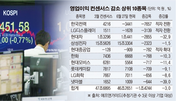 상장사 132곳 영업익 46.3兆 전망 3월 말 대비 1.4兆·연초 8%↓…한국전력 -7657억 감소폭 최대