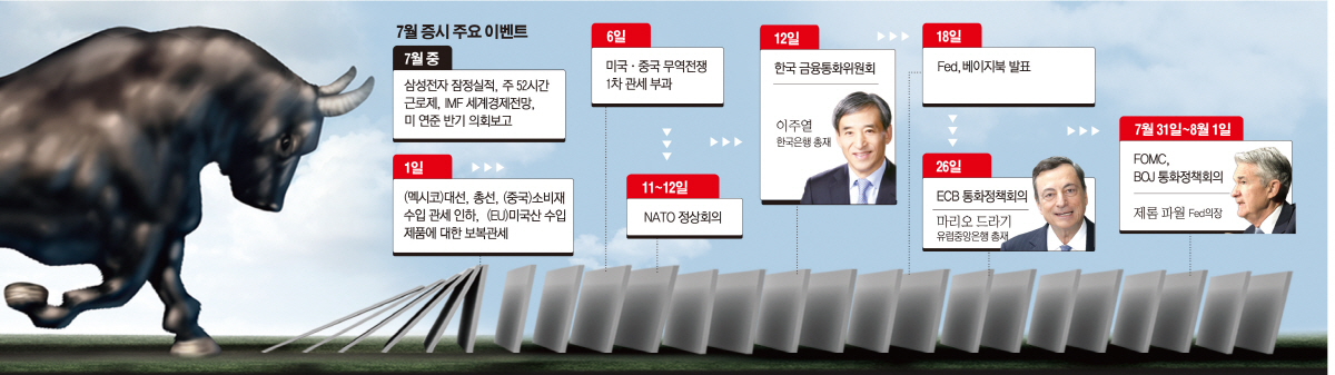 6월은 북·미 정상회담, 미·중 무역분쟁, 미국 금리인상 등 대형 이벤트가 연달아 터지면서 증시를 흔들었다면, 7월은 실적 시즌과 맞물리는 만큼 매수의 기회로 삼으라는 낙관론에 무게가 실린다.