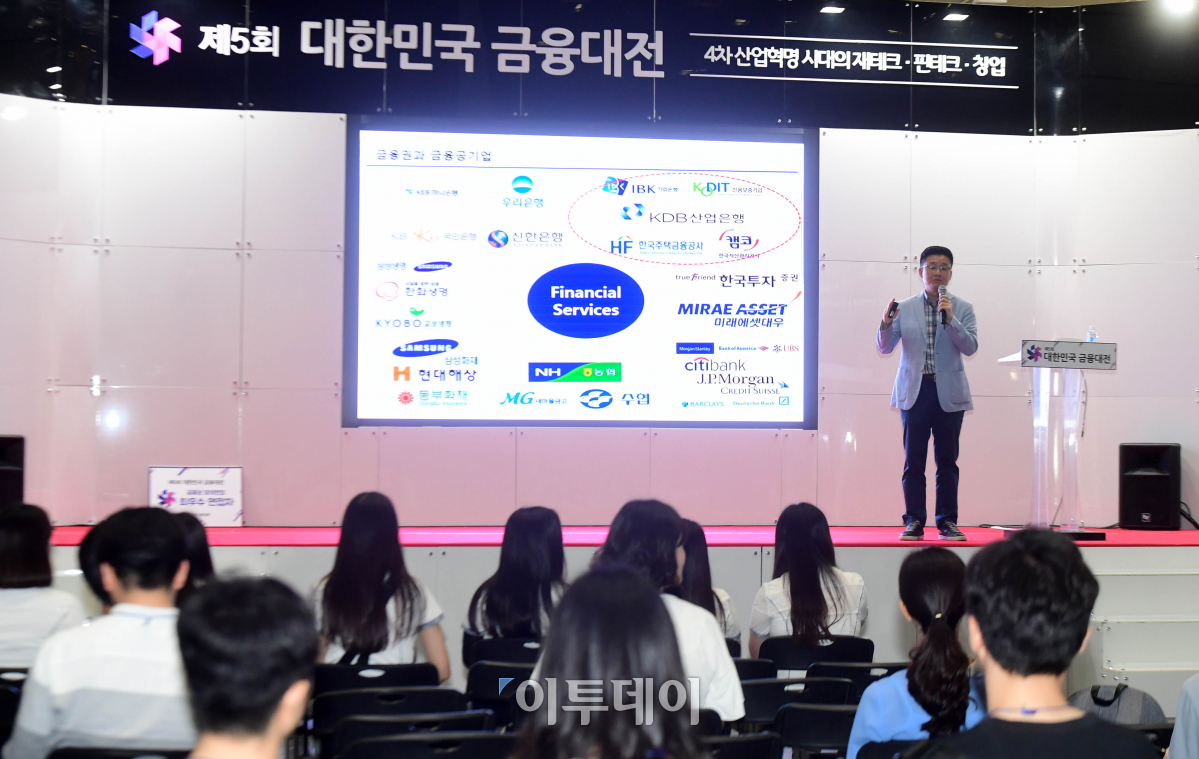 프리미엄 경제신문 이투데이가 주최하는 제5회 대한민국 금융대전 마지막날인 29일 서울 삼성동 코엑스에서 석의현 커리어빅 대표가 '금융공기업 취업전략'을 주제로 강연하고 있다.'4차 산업혁명 시대의 재테크·핀테크·창업'을 주제로 열린 이번 행사에는 13개 시중은행과 기관 70여 곳이 참가한다. 취업준비생들에게 금융권 취업 과정을 경험할 수 있는 기회와 가상화폐·블록체인·부동산·재테크·증권 등 투자 강연을 진행한다. 고이란 기자 photoeran@