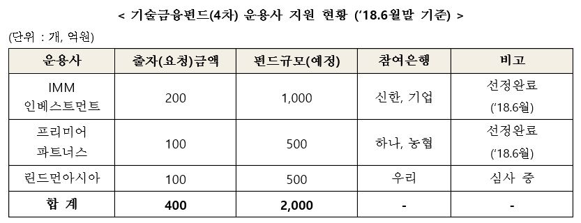 한편, 기술금융 투자펀드는 2015년부터 2017년까지 총 3회차에 걸쳐 13개, 1조 원 규모로 조성됐다. 올해 조성 목표인 2000억 원을 포함 시 총 1조2000억 원으로 늘어날 전망이다. 우수 기술을 보유한 기업들에 총 4464억 원을 투자했다.