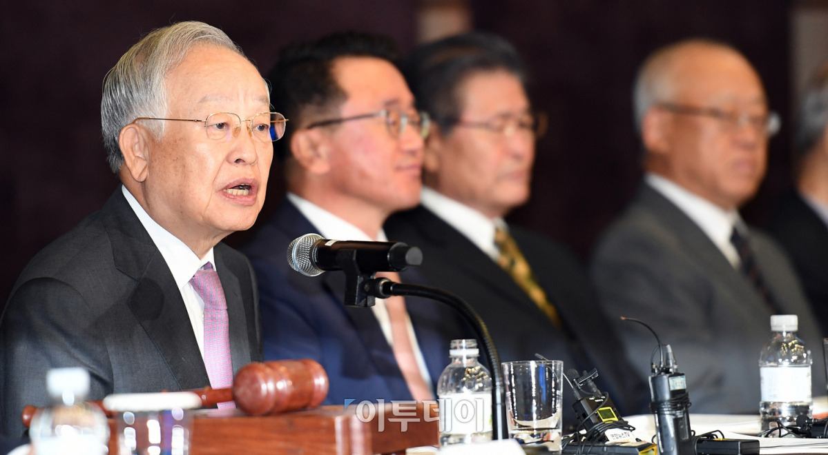 최근 거취 논란과 비자금 조성 의혹으로 내홍을 겪던 한국경영자총협회(이하 경총)가 논란의 중심이었던 송영중 상임부회장을 해임했다. 손경식(왼쪽) 경총 회장이 3일 오전 서울 중구 웨스틴조선호텔에서 열린 '경총 임시총회'에서 인사말을 하고 있다. 오승현 기자 story@