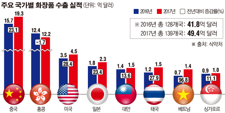 특히 사드의 영향에도 중국 수출이 23.1% 증가하는 등 중화권으로 화장품 수출 강세가 지속하고 있는 것으로 나타났다. 지난해 중국 수출은 19억3228만 달러(2조1844억 원)로 1위를 차지했으며, 그 뒤로 홍콩(12억2245만 달러, 1조 3820억 원), 미국(4억4547만 달러, 5036억 원), 일본(2억2539만 달러, 2548억 원) 등의 순이었다.