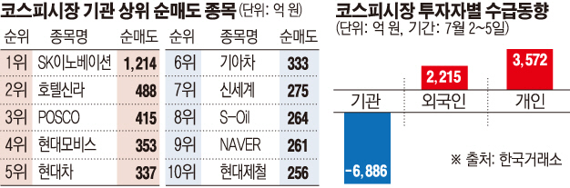 6일 한국거래소에 따르면 이번 주 코스피(유가증권)시장에서 기관은 6886억 원어치를 순매도했다. 같은 기간 개인과 외국인은 각각 3572억 원, 2215억 원어치를 순매수했다. 금융투자업계는 1406억 원어치를 순매도했다.