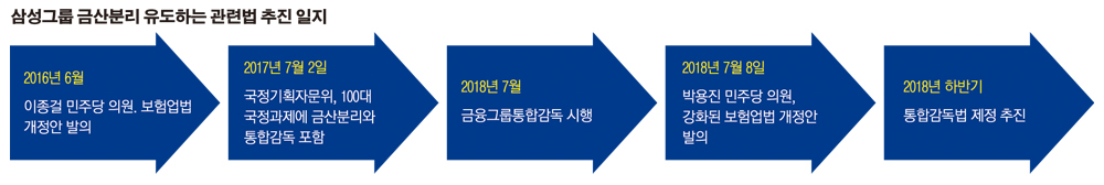 삼성은 현 정부 들어 그동안 여러 차례 지배구조 개편에 대한 압박을 받아왔다. 지난 1월 김상조 공정거래위원장은 “삼성 문제의 핵심은 삼성전자와 삼성생명의 관계”라고 콕 집어 지적하기도 했다. 또 금융당국이 지난 2일부터 금융그룹 통합감독을 시행하면서 삼성그룹은 수년 내에 삼성생명이 보유한 삼성전자 주식을 대부분을 팔아 치우거나 이에 해당하는 최대 30조 원의 자본을 추가 확충해야 한다.