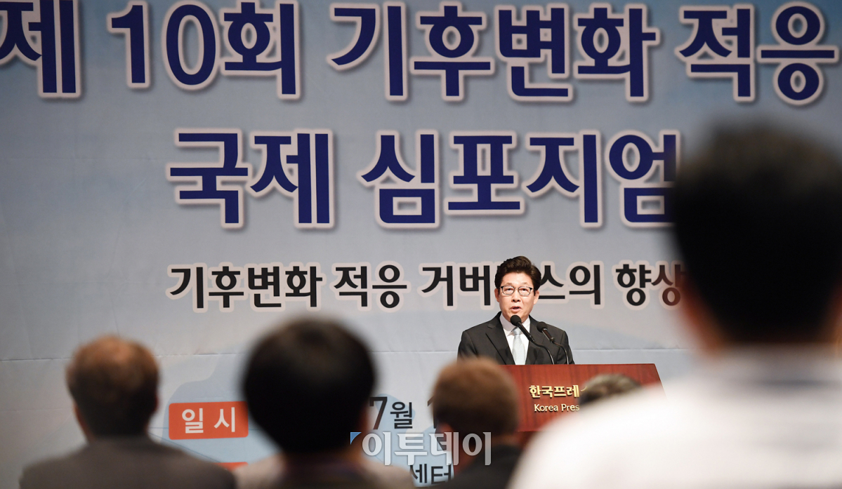 기후변화 적응에 관해 전 세계 전문가가 모여 국내외 최신 정보를 공유하고, 정책 방향을 논의하는 국제회의가 열렸다. '제10회 기후변화 적응 국제 심포지엄'이 열린 10일 오전 서울 중구 한국프레스센터에서 조명래 한국환경정책·평가연구원장이 환영사를 하고 있다. 심포지엄은 유엔기후변화협약과 유럽연합, 독일, 일본 등 국내외 전문가 200여 명이 참석해 기후변화 적응을 위한 거버넌스와 전문기관의 역할을 논의했다. 오승현 기자 story@