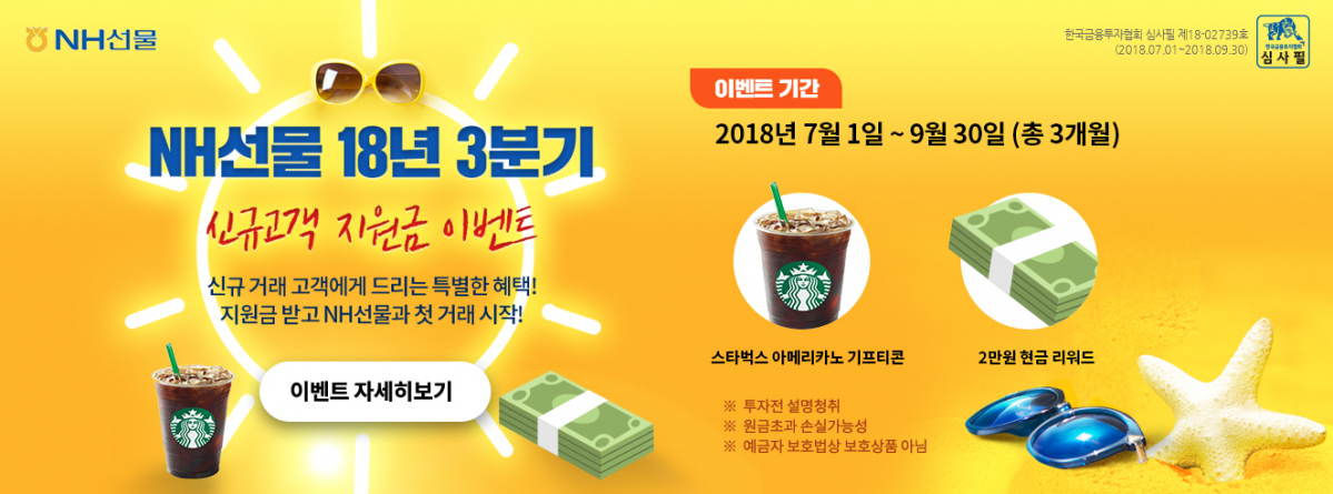 NH선물 국내계좌를 개설한 개인고객이 이벤트 기간 내 첫 거래를 하는 경우 스타벅스 기프티콘을 제공하며 해당고객이 6개월 내 교육이수를 수료한 경우 적격개인투자 교육비 2만 원을 현금 지원해준다. 추가로 타사에서 거래중인 고객이 당사로 계좌 이전 후 첫 거래시 2만 원 현금 리워드를 제공해준다.