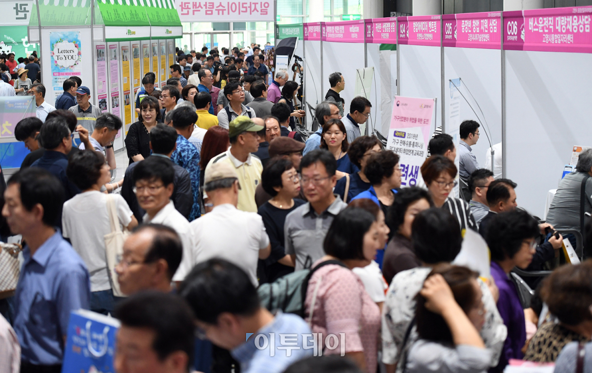 '다시 뛰자! 2018 중장년 일자리 박람회'가 열린 10일 경기도 고양시 일산동구 고양꽃전시관에서 많은 중장년 구직자들이 자신에 맞는 일자리를 찾고 있다. 이번 박람회에 참여한 30개 기업은 현장 면접을 통해 300여 구직자를 채용했다. 오승현 기자 story@