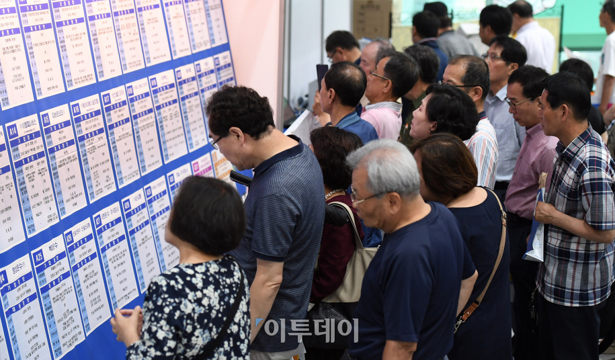 '다시 뛰자! 2018 중장년 일자리 박람회'가 열린 10일 경기도 고양시 일산동구 고양꽃전시관에서 많은 중장년 구직자들이 자신에 맞는 일자리를 찾고 있다. 이번 박람회에 참여한 30개 기업은 현장 면접을 통해 300여 구직자를 채용했다. 오승현 기자 story@