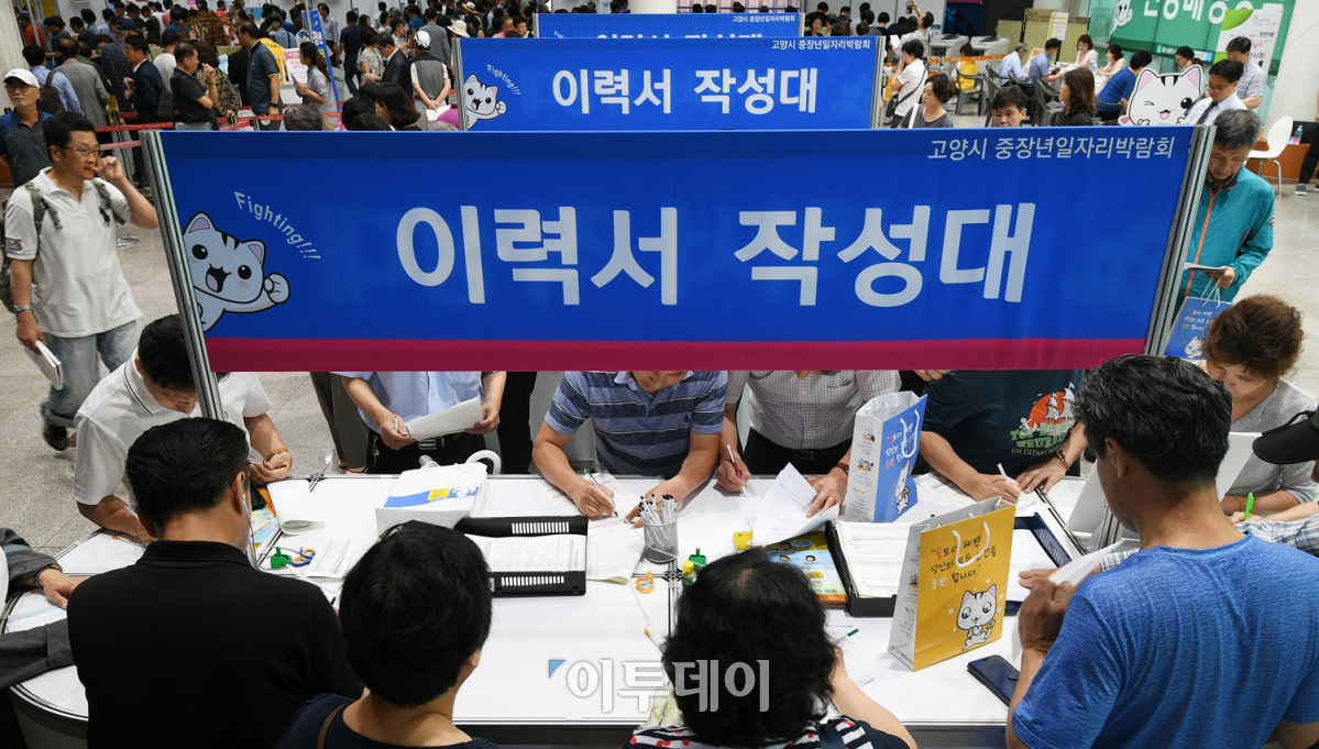 '다시 뛰자! 2018 중장년 일자리 박람회'가 열린 10일 경기도 고양시 일산동구 고양꽃전시관에서 많은 중장년 구직자들이 자신에 맞는 일자리를 찾고 있다. 이번 박람회에 참여한 30개 기업은 현장 면접을 통해 300여 구직자를 채용했다. 오승현 기자 story@