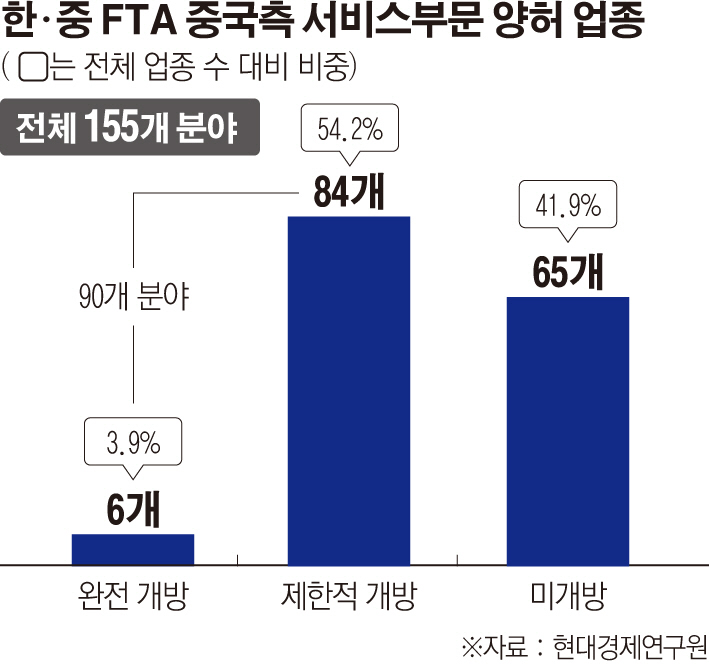 이처럼 현재 우리 기업들의 중국 진출이 제한 또는 미개방된 서비스 분야가 많다는 점에서 한·중 FTA 서비스·투자 후속 협상은 우리 기업들의 중국 시장 진출을 확대할 수 있는 절호의 기회라고 볼 수 있다.