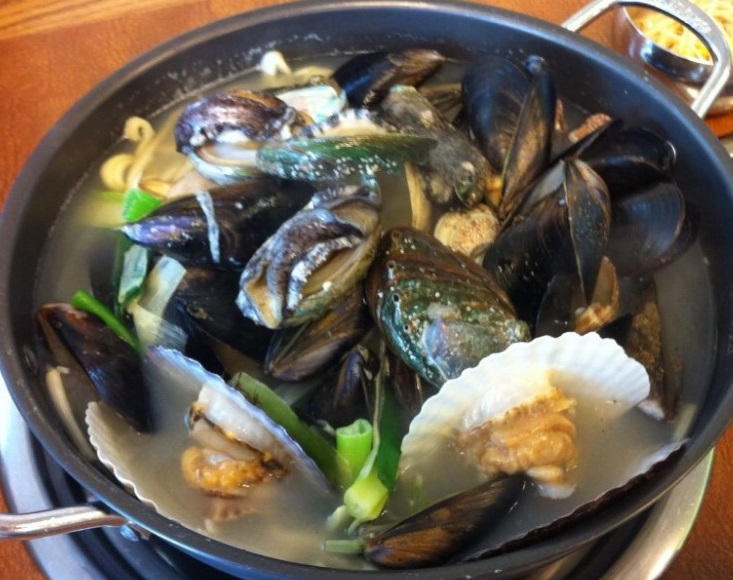 '미애네'에서 대왕 칼국수를 주문하면 냄비 한 가득 낙지, 가리비, 홍합, 전복, 바지락까지 다양한 해물이 들어간 모습이다.