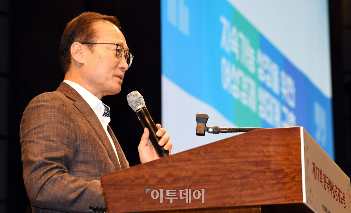 홍영표 더불어민주당 원내대표가 13일 오전 서울 중구 웨스틴조선호텔에서 열린 '제17회 한국여성경제포럼'에서 '지속가능 성장을 위한 여성경제 생태계 구축'을 주제로 강연하고 있다. 오승현 기자 story@