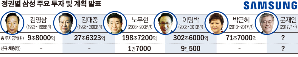 이는 이건희 회장이 특검 사태로 고초를 겪고 경영에 복귀한 뒤 내놓은 투자 계획이다. 그런데 8년이 지난 지금 삼성에선 같은 일이 벌어지고 있다. 이재용 부회장은 이달 9일 인도에서 문재인 대통령을 만났다. 이 자리에서 문 대통령은 이재용 부회장에게 일자리 창출과 국내 투자 확대를 당부했다고 한다. 삼성이 최대 100조원대의 투자계획을 발표할 것이란 관측이 나온 건 이 만남 직후다. 그러면 도대체 8년 전과 지금이 다른 점은 무엇인가. 기업을 때리고 돈 뜯어내는 것과 무엇이 다른가. 이투데이가 추산한 역대 정권별 삼성의 투자 규모는 상상을 초월하는 천문학적 액수다. 노무현 정권 때만 발표한 투자 규모는 무려 200조원에 이른다.