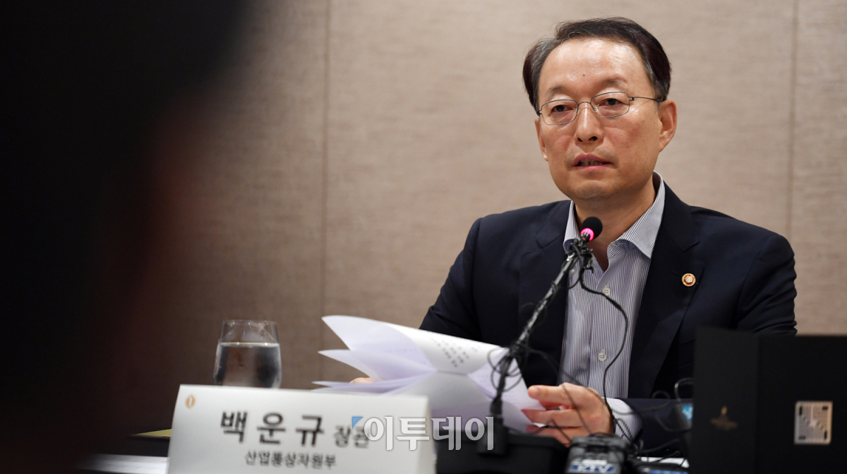백운규 산업통상자원부 장관이 우리나라 주요 12대 기업 최고경영자(CEO)들을 만나 건의사항을 청취하고, 정부의 정책적 역량 집중 및 투자지원을 약속했다. '12대 기업 CEO 간담회'가 열린 16일 오전 서울 강남구 그랜드 인터컨티넨탈 서울 파르나스에서 백 장관이 모두발언을 하고 있다. 오승현 기자 story@