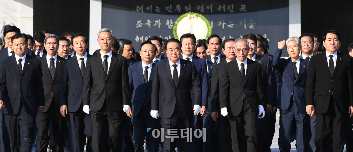 '제70주년 제헌절'인 17일 오전 서울 동작구 국립서울현충원에서 문희상 신임 국회의장을 비롯한 의장단과 여야 지도부 및 의원들이 현충탑 참배 후 현충문을 나서고 있다. 오승현 기자 story@