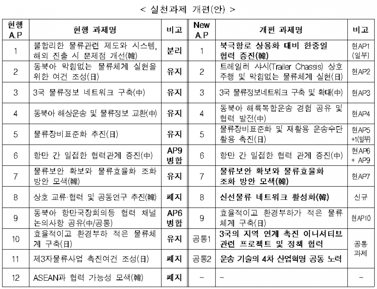 우선 기존 실천과제를 대폭 개편한다. 기존 과제에 대한 면밀한 성과 평가를 바탕으로 12개 과제를 8개 과제로 통‧폐합한다. 또한 3국 간 농수산식품 교역량 증가에 따른 신선물류 네트워크 활성화, 중국의 일대일로, 한국의 신북방‧신남방 정책 등 대외 이니셔티브 프로젝트 협력 등을 신규 과제로 채택할 계획이다.